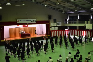 中島校長が「本校は、平成27年に開校したばかりの若い学校。本校で学ぶみなさんに高校3年間で高校生としての自覚と実践してほしいことが3つある。『高校は学問をするところ』、『強く逞しい心と身体をつくること』、『集団生活の中で、連帯と友情の輪を広げていくこと』。これら3つのことを心に留め、自分の目標に向かい努力を続けてほしい。」と式辞を述べました。