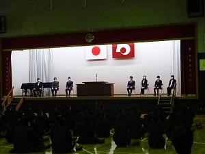 始業式に先立って行われた新任式では、新たに7名の教職員の先生方を迎えました。生徒会長の村田さん(3年次)が歓迎のあいさつを行い、和やかな雰囲気で先生方を迎えました。