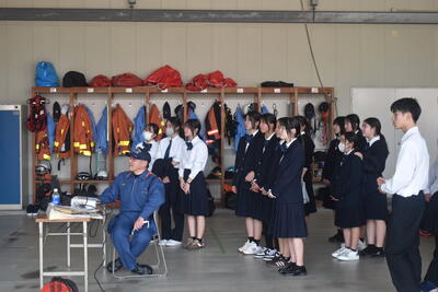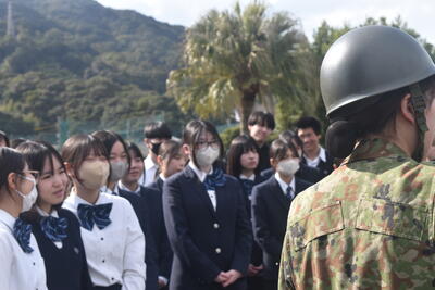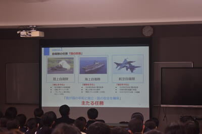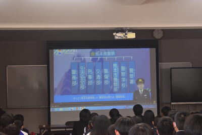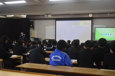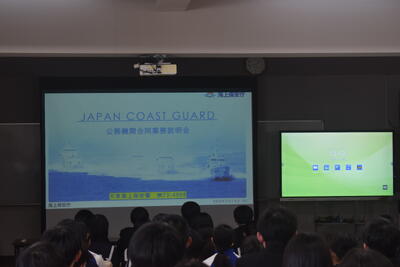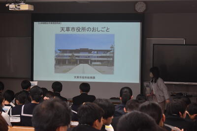 今回ご参加いただいたのは、天草海上保安署、牛深警察署、自衛隊、南消防署、天草市役所の皆様です。はじめに各機関より、仕事内容ややりがい、必要な資質などについて説明をしていただきました。生徒たちはスライドや配付資料を見ながら真剣に話を聞き、それぞれの仕事について理解を深めていました。
