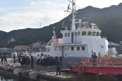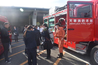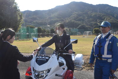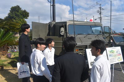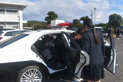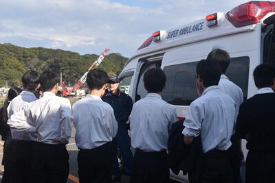 説明後は屋外に移動し、自衛隊車両、パトカーや白バイ、消防車や救急車、そして海上保安庁の巡視船を見学しました。実際に車両に乗せていただいたり、装備に触れさせていただいたりする中で、生徒たちは興味津々に質問を重ね、職業への関心を一層高めている様子が見られました。