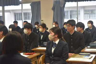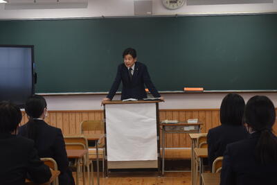 家庭学習期間を前に、3年次生は6・7時限目で年次集会を実施しました。先生方より卒業前の過ごし方や受験組は進路決定に向けた心構えについてお話があり、生徒一人ひとりが目標など再確認する機会となりました。