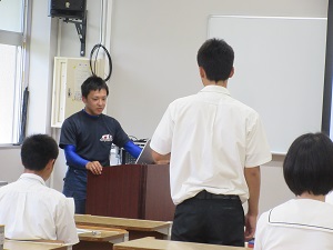 牛深高校(附則)の卒業生である西﨑消防士(天草広域連合南消防署)が来校し、消防士の職業について教えていただきました。