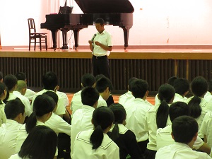 5月28日(火)、今年度最初の全校朝礼が行われました。今月は、生物の大塚先生に講話をしていただきました。大塚先生は、「人間が持っているすばらしい能力」についてお話されました。