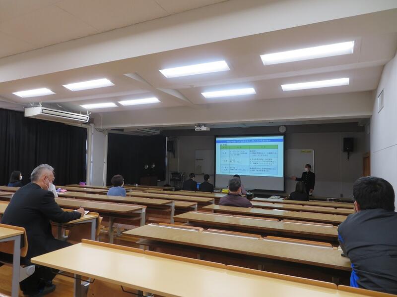 また今回はスペシャルゲストとして、大津町より翔陽高校の代表生徒9名(工業系列)の皆さんにお越しいただき、感染症予防対策について研究成果発表を行っていただきました。