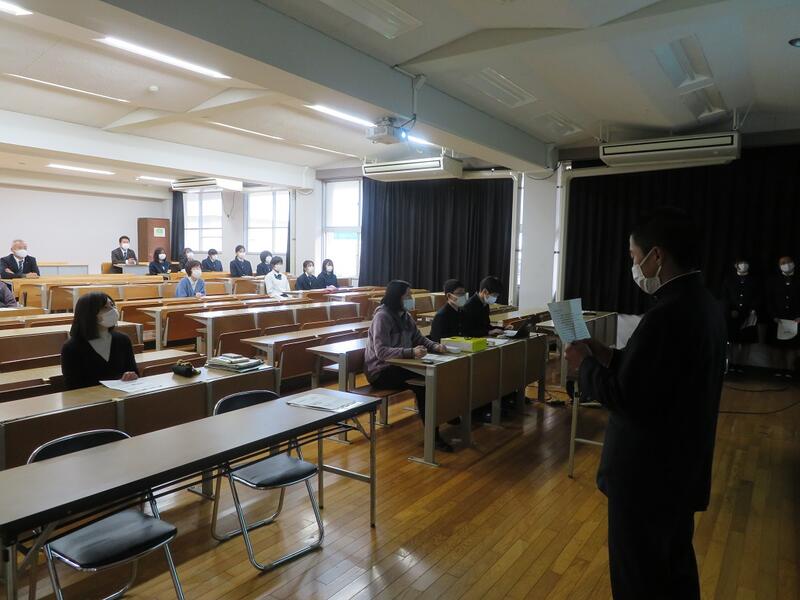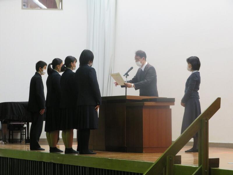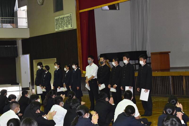 表彰式では、陸上競技部や読書感想文コンクール、ボランティア活動、英単語オリンピックなどで多くの生徒が表彰を受けました。