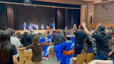 いよいよボーズマンハイスクールでの初舞台。ボーズマン高校の生徒300人と、様々な国から研修に来られた先生方へ『牛深ハイヤ節スペシャル』を披露しました。
