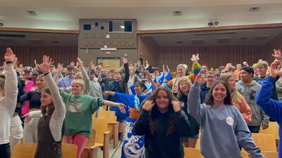 『一緒に踊って楽しもう!』の英語レクチャーを担当した2年・山角くんの感想「英語での説明がアメリカの高校生に通じるか不安もあったけど、しっかり伝わり、一緒に楽しく踊ってくれてとても嬉しかった。アメリカの高校生の歓声の大きさや盛り上げに勇気をもらった」