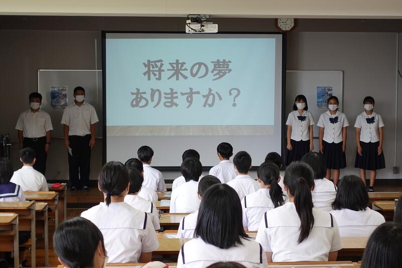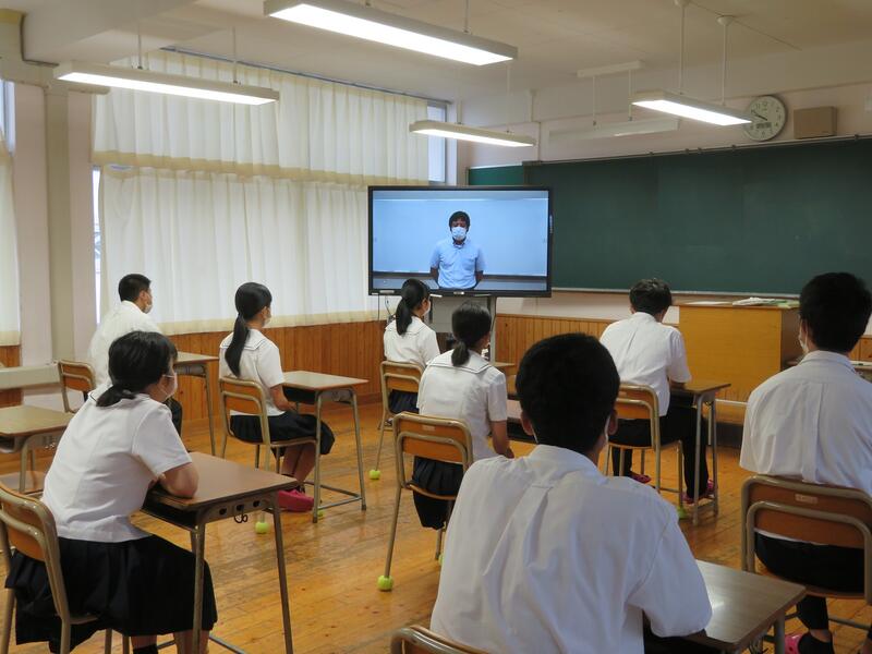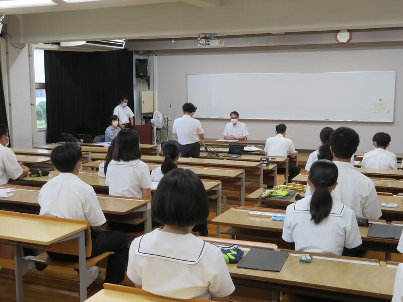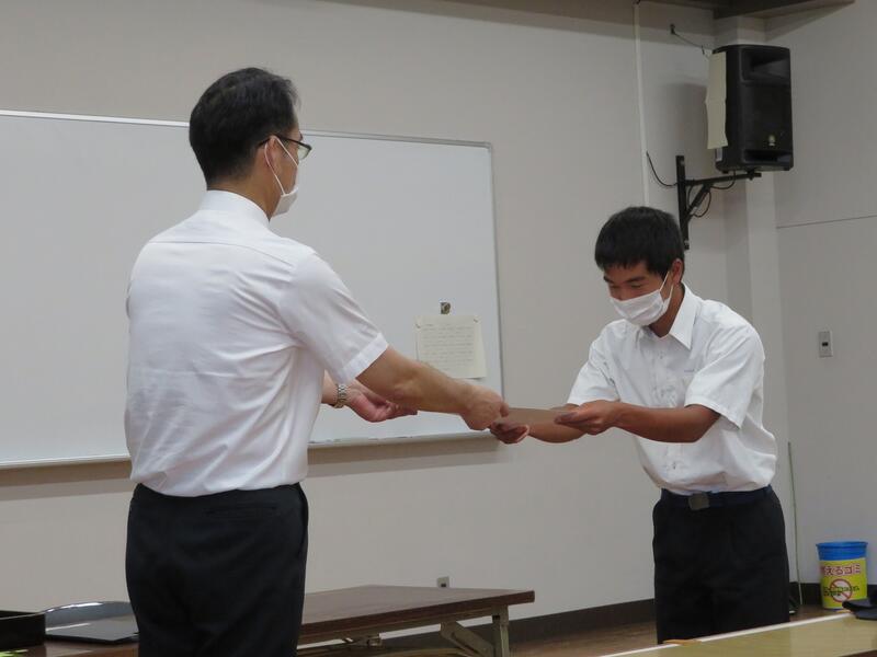 表彰式および一学期終業式、吹奏楽コンクール推戴式が行われました。新型コロナ感染予防のため、教室でリモートでの実施となりました。