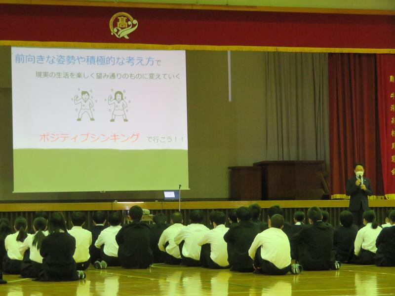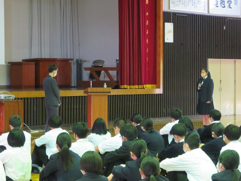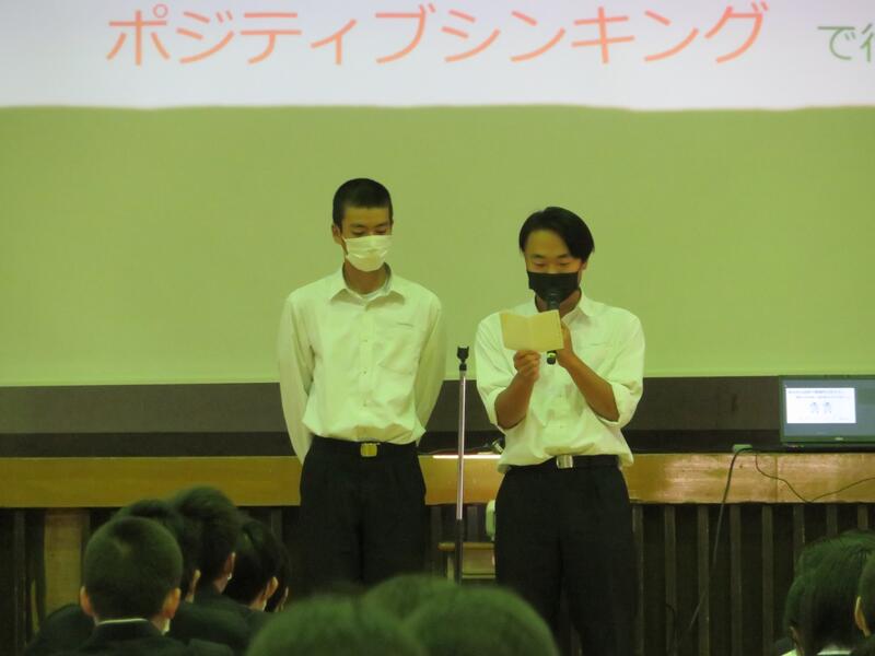 11月の全校朝礼が行われました。職員スピーチでは、牛迫教頭先生より稲盛和夫さんによる「人生成功の方程式」の紹介や、今後の生活を楽しく望み通りのものにしていくためにポジティブシンキングで行こう!というお話がありました。生徒代表スピーチでは、2年次の松﨑君と浅見君が、今後身につけていきたいことや部活動のキャプテンとして頑張りたいことなどを話してくれました。