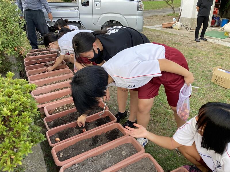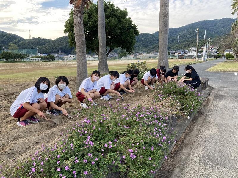 1年~3年次43名の生徒が参加し、学校周辺の清掃活動と卒業式に向けてチューリップの球根を植えました。この球根は、花いっぱい運動として公益財団法人日本教育公務員弘済会様からいただきました。100個の球根をプランター、正門や生徒昇降口の花壇に心を込めて植えました。また、清掃班は、道沿いや海岸をに捨てられた大きな発泡スチロール、ゴミを拾うことができました。牛深の海をきれいに保つことの大切さを改めて実感したボランティア活動になりました。