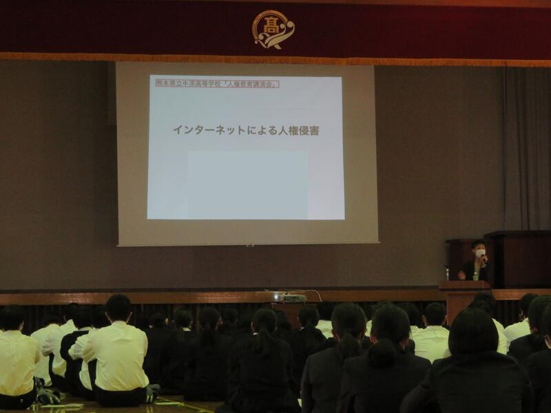 本日、モバイル・ネットワーク研究所の松川様を講師としてお招きし、「インターネットによる人権侵害」をテーマに人権教育講演会が行われました。講演では、インターネットにまつわる具体的なトラブルの事例やインターネットを利用する際に知っておきたいことなどをお話しいただきました。とても気軽に利用できるからこそ、そこに潜む危険などをしっかりと知り、インターネットについて正しく理解しておくことが大切であることを学ぶことができました。