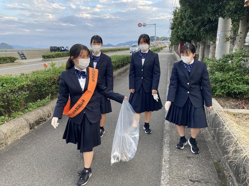 1年~3年次19名の生徒が参加し、学校周辺の清掃活動を行いました。道沿いのたばこの吸い殻、海岸に捨てられた釣り客のゴミの多さに驚いた清掃活動となりました。牛深の海をきれいに保つことの大切さを改めて実感することができました。一人一人の心がけでポイ捨てはなくなるため、環境保全の大切さを継続して伝えていきたいと思います。