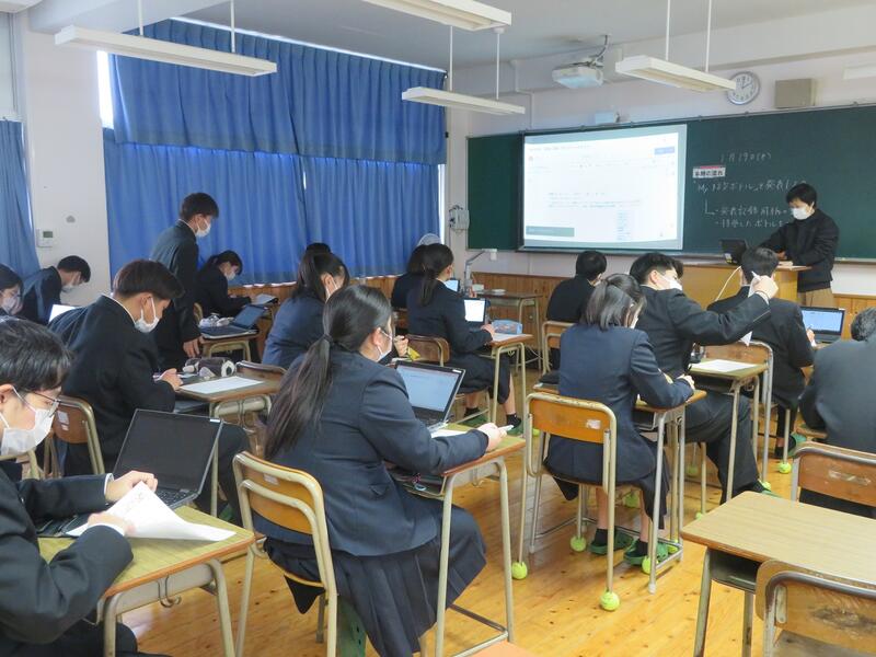 6・7限目は、牛深総合体育館に職業別18ブースを設け、大学・短大・専門学校の方から職業に関するオンライン講義をしていただきました。生徒は、事前に希望した各ブースを3巡回し、真剣に話を聞いていました。