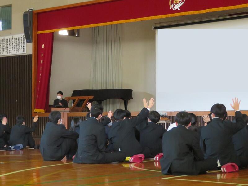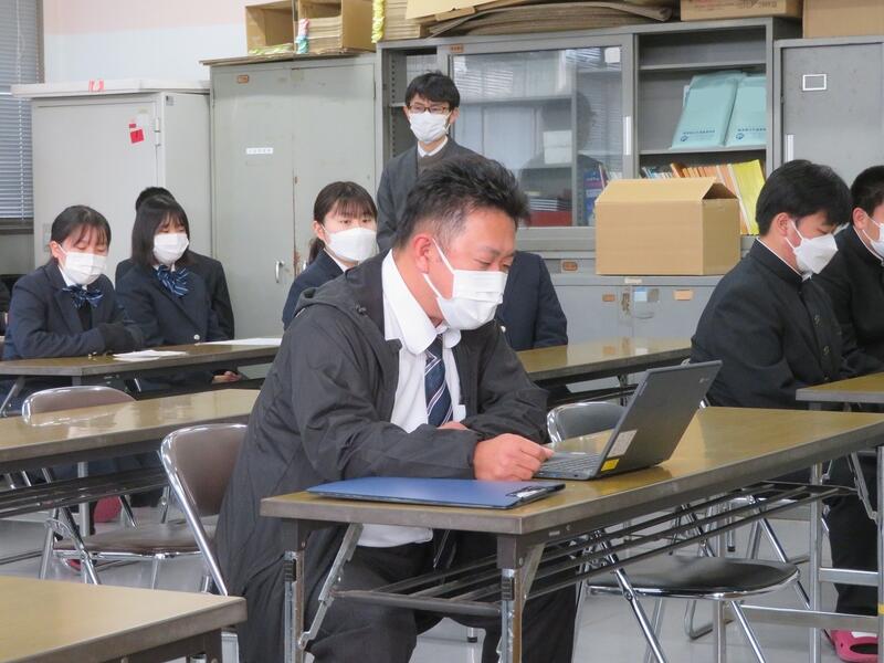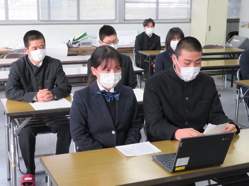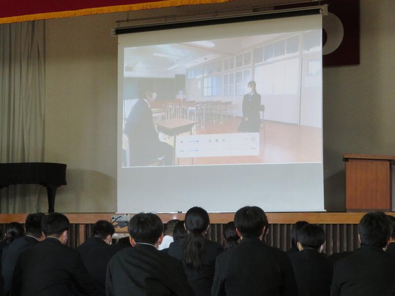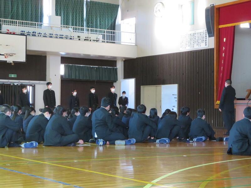 2月の全校朝礼が行われました。職員スピーチでは、安枝先生より大学時代に学んだ教育心理学について、印象に残っているお話をしていただきました。3年次生には、今後学びを深めてほしいこと、1・2年次生には偏見のない見方を身につけてほしいことなど、正しいものの見方が大切であるというメッセージが送られました。クラス代表スピーチでは、1年次生の宇左美君、榎田君、門口君、江﨑さん、山﨑さんがカメラの前に登場してくれました。インターンシップなど様々な経験をすることができたことや、部活動を通して成長することができたことなど、この一年を振り返っての思いを話してくれました。