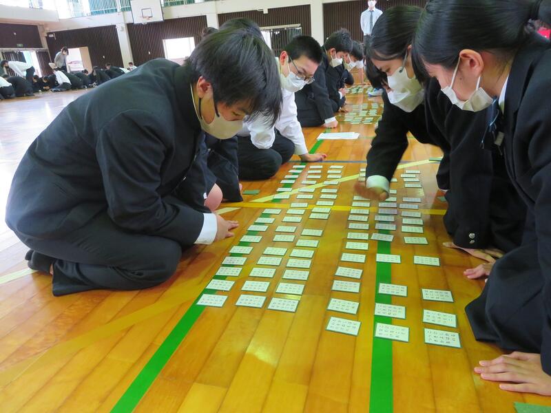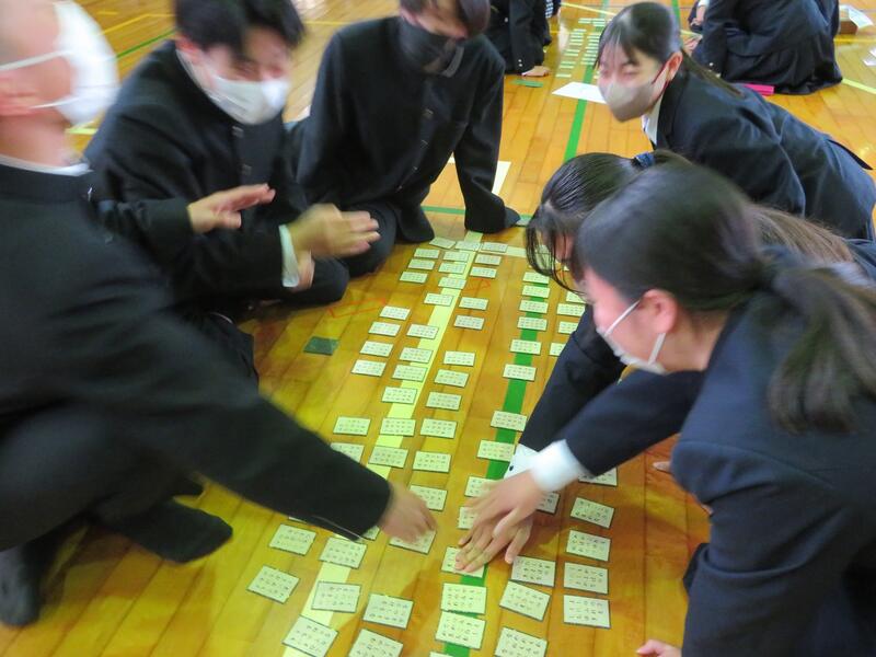 4年ぶりに校内百人一首大会が行われました。試合はチーム対抗で行われ、1回戦は源平戦形式、2回戦はちらし形式で対戦しました。それぞれの得意札が読まれた時などはとても盛り上がり、各所で白熱した戦いが繰り広げられました。日本の伝統ある文化に親しむことができ、楽しい時間を過ごすことができました。