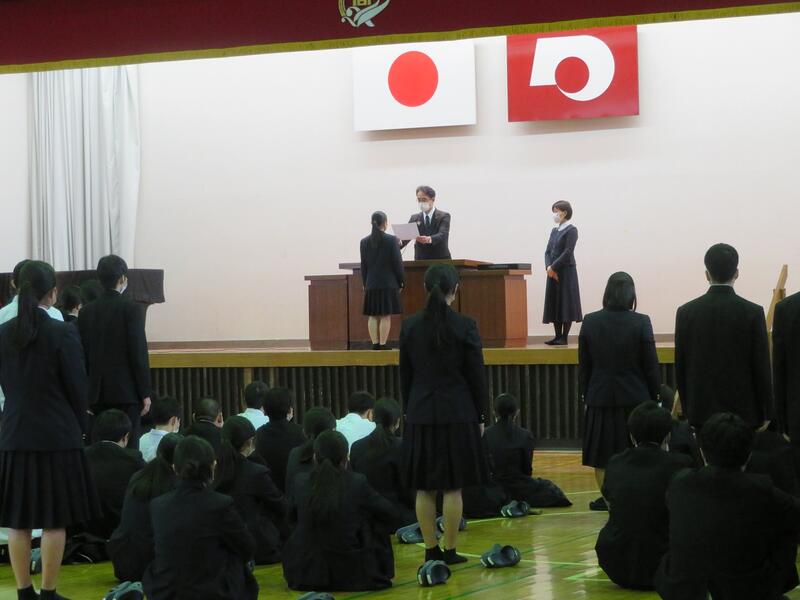 3学期の表彰式と令和4年度の修了式が行われました。表彰式では部活動や今年度の皆勤・精勤の生徒が表彰を受けました。修了式では、木原校長先生より、「いい人になること」「正直でいること」の2つのことを意識して過ごしてほしい。誰にでもできて、簡単にできることではあるけれども、人間として大きく成長していくために大切なことであるというお話がありました。