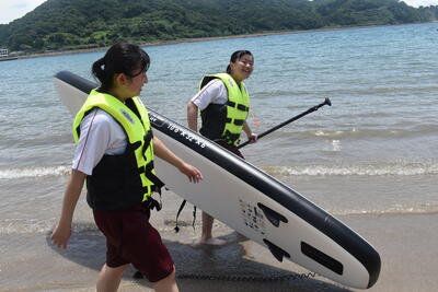 SUP体験は体育の上原先生のご指導の下、ライフジャケットの装着から丁寧な説明がありました。初めて体験する生徒ばかりでしたが、すぐに乗りこなしていました。