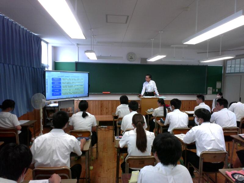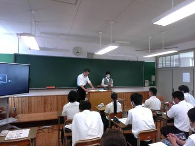 天草信用金庫より総務部副部長 近藤様、本校OBの松下様のお二人にご来校いただき、1年後に進路選択を控えた2年次生に出前授業をしていただきました。天草信用金庫はフォトコンテストや「あましん」スタジアム(ネーミングライツ)の名前で生徒たちにも親しみのある金融機関です。