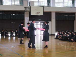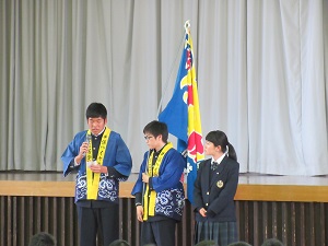 代表生徒からクラスに記念品が贈呈されたあと、生徒会執行部の紹介、部活動紹介が行われました。委員会活動や部活動にも積極的に取り組んでほしいと思います。