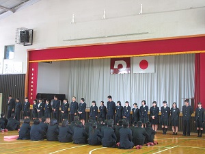 その後牛高スピリッツ「明るいあいさつ・意欲的な活動・けじめのある生活」の説明の後、全校生徒で復唱し、校歌を歌いました。1年次生も集団宿泊研修で習った校歌を堂々と歌い、牛深高校生の一員としてスタートを切りました。