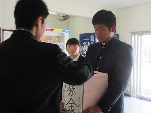 牛深高校生として今できることとして、生徒会を中心に19(火)~21(木)募金活動を行いました。また、いざという時の避難袋を各自で教室内に準備しようという呼びかけもありました。