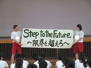 4月20日(木)、体育大会結団式が行われました。はじめに、生徒会より体育大会テーマ「Step to the Future ~限界を超えろ~」が発表されました。