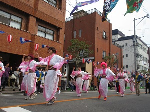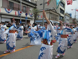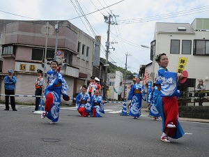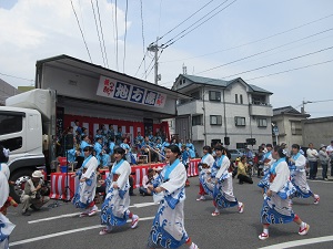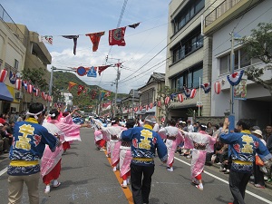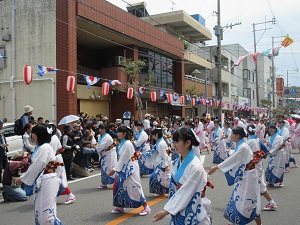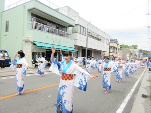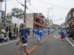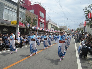 プラカードを持った生徒会長を先頭に、郷土芸能部、1年次生、2年次生、3年次生と続きました。天候にも恵まれ、全校生徒で楽しく踊ることができました。沿道にも、たくさんの方々にお越しいただきました。運営スタッフのみなさん、ありがとうございました。