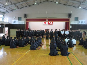 平田校長より「数々の名場面が生まれる大会。昨年は、熊本地震のため中止となったが、今年大会が開催されることに感謝してほしい。練習に一生懸命な姿を見て、その成果を発揮してほしい。新しい牛深高校となり牛高生の未来を切り拓く最初の年、残る生徒たちも心をひとつに応援し絆と誇りを高めてほしい。」と激励の言葉が送られました。