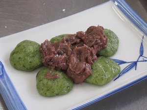 よもぎの葉を摘み団子を作り、あんこを添えて『草もちのからみだんご』の完成。お好みできな粉も添えて、春の味覚を味わいました。