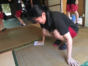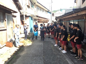 蔵内外の清掃を行い、牛深歴史文化遺産の会・吉川茂文会長からお話を伺いました。江戸時代から続いた豪商・浦田家が所有する「万屋の蔵」は、江戸末期に建てられたそうです。故・浦田智美さんは、牛深ハイヤ節を現在の形に振り付けた舞踊家で、本校郷土芸能部に踊りの指導をしていただいたこともあり、毎年お盆にはお墓参りに行っています。