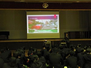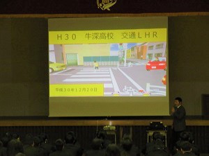 まず交通事故防止の動画を視聴しました。事故は、一瞬で被害者・被害者の家族や友人、そして加害者やその家族をも不幸にします。県内では、昨年1年間で交通事故によって県内の高校生224人が負傷し、8割が自転車・原付に乗車中のケガだと言われています。