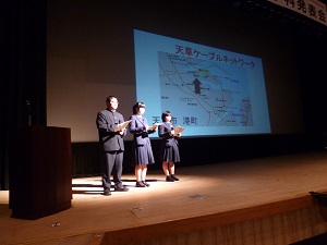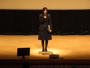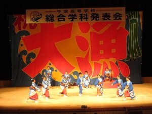 オープニングアトラクションとして郷土芸能部が笑顔で元気いっぱいの「牛深ハイヤ踊り」を披露しました。開会では、学校長あいさつ、生徒会長・畑中さんによるあいさつ、生徒会執行部による学校紹介がありました。その後、各年次の代表生徒による発表、3年次子ども文化選択者によるしろはと保育園の園児とのダンス、2年次マーケティング選択者による販売実習報告など8つの団体が発表しました。各発表者がこの1年の学びの成果を堂々と発表し、地域の魅力や地域への思いを熱く語る場となりました。