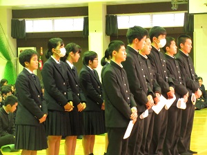 はじめに表彰式が行われ、陸上競技部・弓道部・書道部・熊本県高等学校総合文化祭標語・家庭クラブ研究発表大会・校内英単語オリンピックの9つの表彰を行いました。