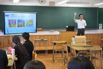 前半は生徒会執行部の生徒や協力生徒がそれぞれの出身中学の後輩たちに向けて、牛深高校についてプレゼンテーションをしました。