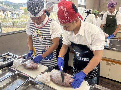 真鯛を1人一尾3枚おろしにするということで、みんな真剣な表情で取り組みました。日ごろから魚釣りが趣味で慣れている生徒は、講師の先生方から「センスがある!」と褒められていました。