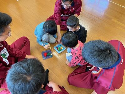 フェルトで制作した「豆」のおもちゃ使った「お箸で豆つかみゲーム」など、授業で計画した保育活動を実践させていただきました。短い時間でしたが、保育士さんの園児の成長を促し、見守られている様子はとても勉強になりました。