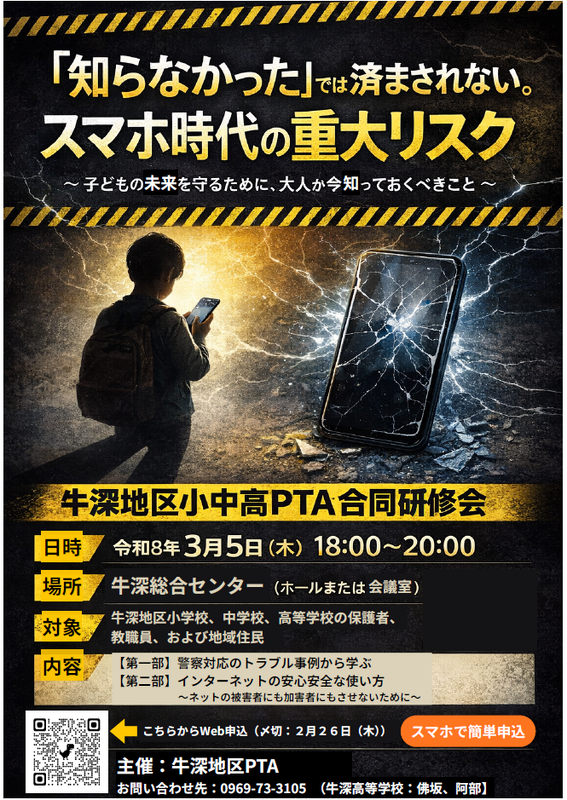 3月5日(木)18時から、牛深総合センターにて、牛深地区小・中・高校PTA合同研修会を開催します。