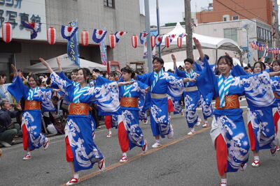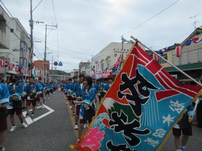 地元のほかの団体と共に商店街をパレードし、祭りをしっかり盛り上げられるよう全員で頑張りました。