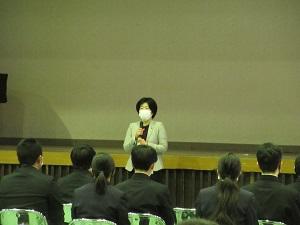 先生は、ある失敗についてお話ししてくださいました。先生は、高3の1月、ちょうど今の時期に進路変更をされたそうです。過去の選択の失敗の中でもあきらめずに自分の目標に向かって努力したことで、今があるとお話されました。私は、講話を聞いて「失敗は成功のもと」という言葉が思い浮かびました。先生が教えてくださった「あきらめないこと、先生方のアドバイスをしっかり聞くこと、知識や視野を幅広く持つこと」、この3つのポイントが大切だということが分かりました。
