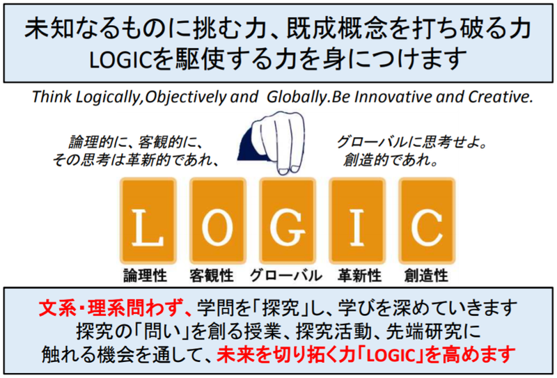 は、これらを参考につくりました。しかし、世の中には科学的に装って商品を売っているものや、疑似相関関係によって誤解を招くデータがあるのも事実です。これらのいわゆる“疑似科学”に騙されないためにも、論理的思考力は本校生にとって欠かせない力と位置付けています。そのため、全員が論理的思考力を身につけられるよう「LOGIC」を合い言葉に、理系だけでなく文系に進む生徒も含め、全員が探究活動や課題研究に取り組んでいます。
