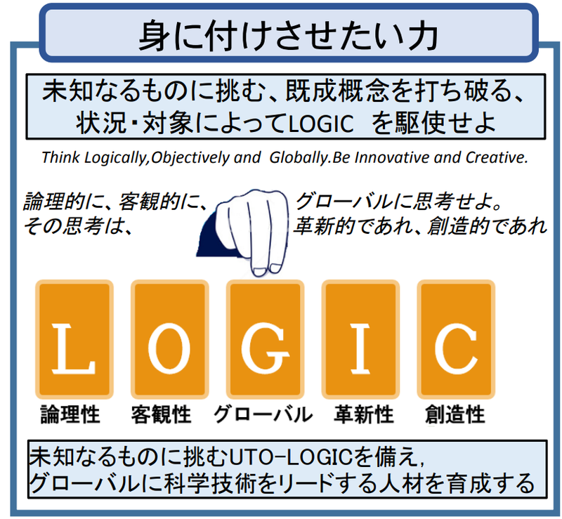 本校が定義した生徒に身につけさせたい力です。 LOGIC(論理性・客観性・グローバル・革新性・創造性)を駆使して,既成概念にとらわれることなく未知なるものに挑む態度を身に付けることを目標にしています。また,授業及び探究活動の評価指標ともなり,他に先駆けての宇土校ならではの取組がモデルとなることを目指しています。 キー・コンピテンシー「LOGIC」 論理的に,客観的に,グローバルに思考せよ。その思考は革新的であれ,創造的であれ Think Logically,Objectively and Globally.Be Innovative and Creative. |