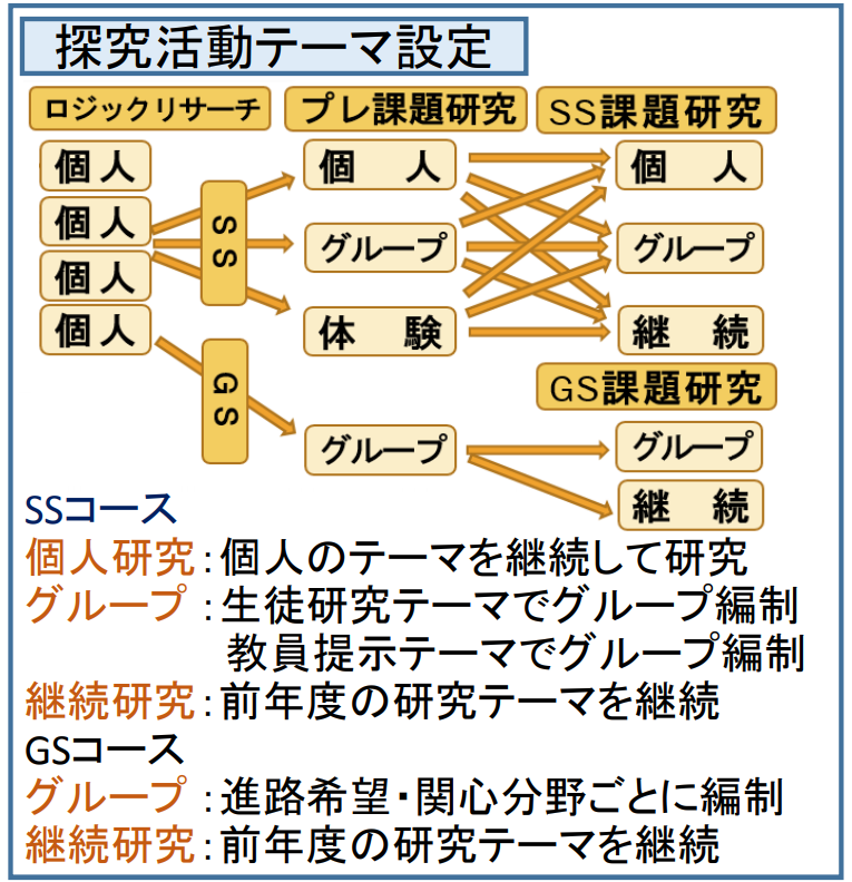 探究のプロセスを複数回、経験することで質が高く,深い探究活動を可能にしています 課題を設定し、情報を収集し、整理・分析し、まとめ・表現する探究のプロセスにおいて,もっとも頭を悩ませるのが課題の設定、いわゆる「テーマ設定」です。 本校では、高校1年「ロジックプログラム」で、ロジックリサーチとプレ課題研究の2回、高校2年以降、「SS課題研究/GS課題研究」の1回、合計3回のテーマ設定を全員が経験します。 複数回、経験する探究のプロセスを通して「テーマ設定力」を高めるとともに、『探究の「問い」を創る授業』を通して「問い」を創る力を高めることで、高校2年以降、本格的に取り組むSS課題研究/GS課題研究で質が高く,深い探究活動へとつなげています。 生徒全員が1人1テーマ設定して探究するロジックリサーチを経て、プレ課題研究のテーマ設定する際、「個人研究」、「グループ研究」、「研究室体験」の3つから選択します。ロジックリサーチを個人でさらに深めるもよし、グループを編制して深めるもよし、先輩が確立した手法を活かして探究するもよし,個々に応じたテーマ設定が可能です。 |