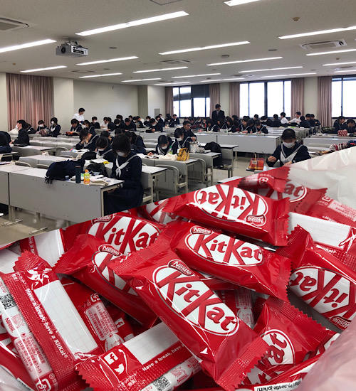 昨年卒業したバレー部OBがキットカットをたくさん買って早朝から駆けつけてくれ、「自分は熊大の近くに1人暮らしをするようになった。会場が近かったので、後輩たちにも頑張って欲しいという思いで応援にきました!」と話してくれました。受験生の表情からもそのキットカットで緊張がとけていたように見えました。