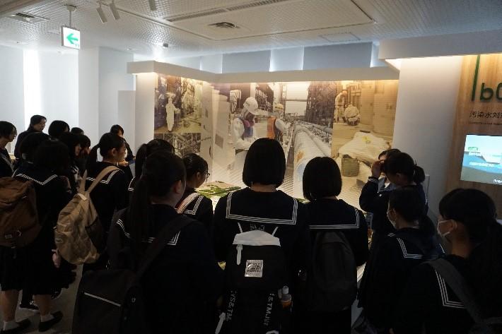 事前学習で福島の原子力災害について学んできた3組38名の生徒は、はじめに富岡町の「東京電力廃炉資料館」を訪れました。専任ガイドから事故と廃炉作業について説明を受けました。福島第一原発の廃炉作業の立体映像等の情報を見ることで実際に現地で体験したような臨場感に驚いていました。