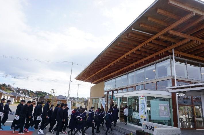 次に訪れた「ならは笑ふるタウン」では、他の2クラスと合流し、3クラスが「みんなの交流館・ならはCANvas」の中で、一般社団法人ならはみらいのガイドによる説明を受けました。楢葉町は原子力災害の影響で全町避難を余儀なくされ平成27年9月に避難指示区域解除となり、復興の拠点としてまちの再生がここから進められていることを学び、生徒達は関心をもって復興商店街を見て回り買い物をしていました。