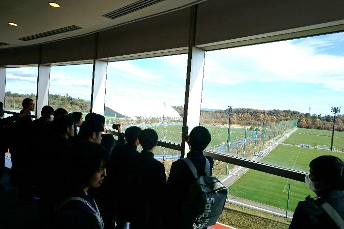 最後は復興のシンボルとして、来年の東京オリンピックの聖火のスタート地点にも選ばれたサッカーナショナルトレーニングセンター Jヴィレッジを訪問しました。震災後から現在までの歩みを職員から説明を受け、再オープンまでの多くの課題を乗り越えてきた話を真剣に聞き入っていました。最後はフィールド全体が一望できる4階フロアから見た芝の緑あふれる景色を目の当たりに、そのすばらしさに感動していました。