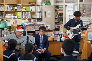 放課後に、図書館にてライブラリークリスマスコンサートを行いました。今回は、おなじみの原先生に加え、初出場の内場先生と松村先生にも加わっていただき、クリスマスソングを始め、たくさんの歌を披露していただきました。50名を超える生徒が図書館に来てくれ、大盛り上がりとなりました。コンサートが終わった後も図書館に残り、ALTの先生方と楽しく会話していました。
