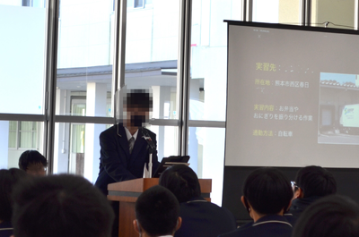 普通科では、熊本県特別支援学校技能検定(清掃)の表彰や生徒指導について冬休みの過ごし方の話、生徒が応募した作品の展示紹介を行いました。