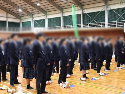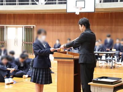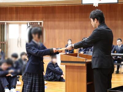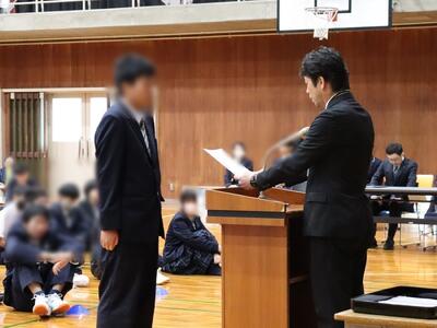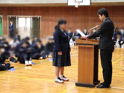 3月19日(木)体育館で「令和7年度(2025年度) 1・2年修了式」が行われました。式前には1年間の無欠席者表彰が行われ、代表の生徒が校長から表彰状の授与を受けました。