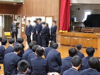 3月11日(水)に今年度最後の全校集会が実施されました。「新委員長発表」、「令和7年度 校則検討委員会 報告」、「ふるさとくまさんデー」についての発表がありました。